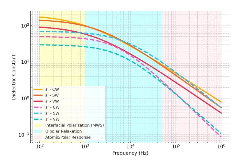 In this study, the electrical and dielectric properties of maple wood (Acer trautvetteri Medw.) were comprehensively investigated under three different surface conditions: untreated control (CW), two-week water immersion (SW), and double varnish (VW), as well as a function of frequency. For the accuracy of electrical analysis, all test samples were evaluated in dry state and comparative analysis was performed between surface treatment groups. In the experimental analyses in the frequency range from 100 Hz to 1 MHz, reel/imaginary part of dielectric permittivity (ε′ and ε″), dielectric loss factor (tanδ), alternating current electrical conductivity (σac), specific heat capacity (C), conductivity-dependent free energy component (G/ω), and real (Z′) and imaginary (Z″) impedance components were comprehensively evaluated. According to the test results, the SW test samples, with their high (ε′) and (ε″) values, were found to provide significant ionic and dipolar contributions. However, due to their high (tanδ) and (σac) values, their energy storage capacity is limited, and their conductivity potential is high. The VW test samples, with their low (ε″) and (tanδ) values, exhibit strong insulating properties, making them suitable for high-frequency capacitive applications. The CW test samples, in contrast, exhibit a balanced conductivity-insulation profile with moderate dielectric response. Impedance analyses (Z′, Z″) revealed that the low-resistance ion transport mechanism dominates in the SW test samples, while the surface coating creates a high-resistance barrier, thus limiting charge transport in the VW test samples.